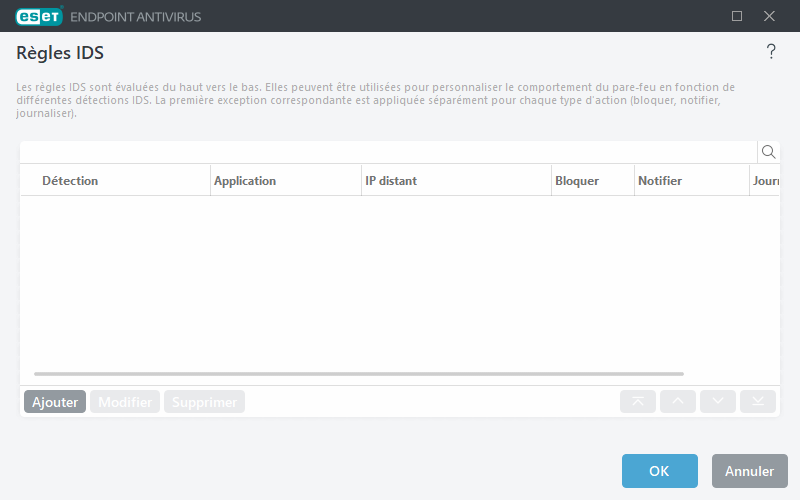 - Supprimer - Sélectionnez et cliquez si vous voulez retirer une règle IDS de la liste des règles IDS.
