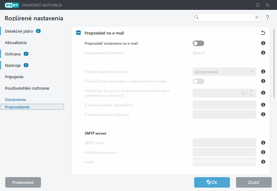 ESET Endpoint Antivirus podporuje automatické odosielanie e‑mailových oznámení pri výskyte udalostí so zvolenou úrovňou závažnosti. Ak chcete aktivovať posielanie e‑mailových oznámení, otvorte Rozšírené nastavenia > Používateľské rozhranie > Oznámenia > Oznámenia na ploche > Preposielať na e‑mail a zapnite možnosť Preposielať oznámenia na e‑mail.