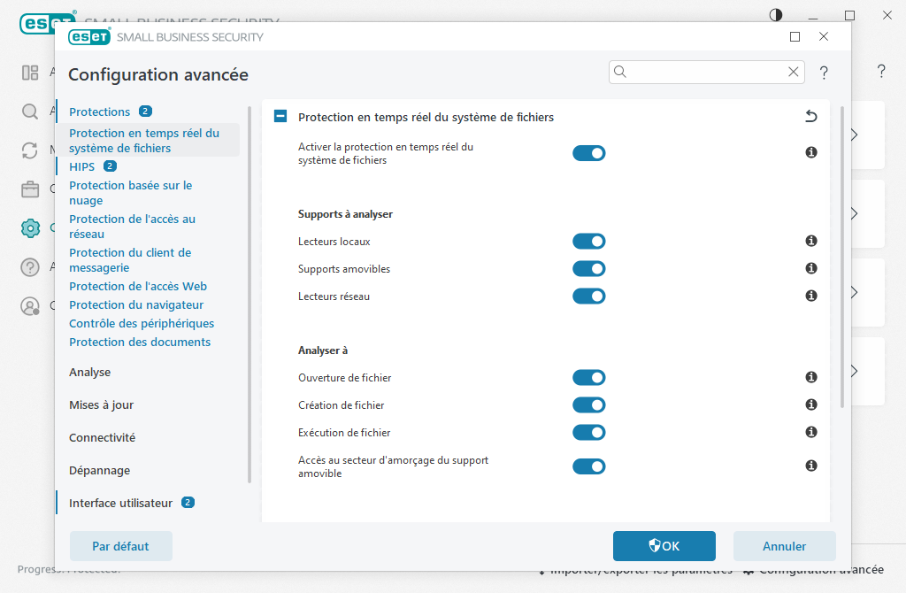 La protection en temps réel du système de fichiers contrôle tous les fichiers du système pour détecter les codes malveillants lorsqu'ils sont ouverts, créés ou exécutés.