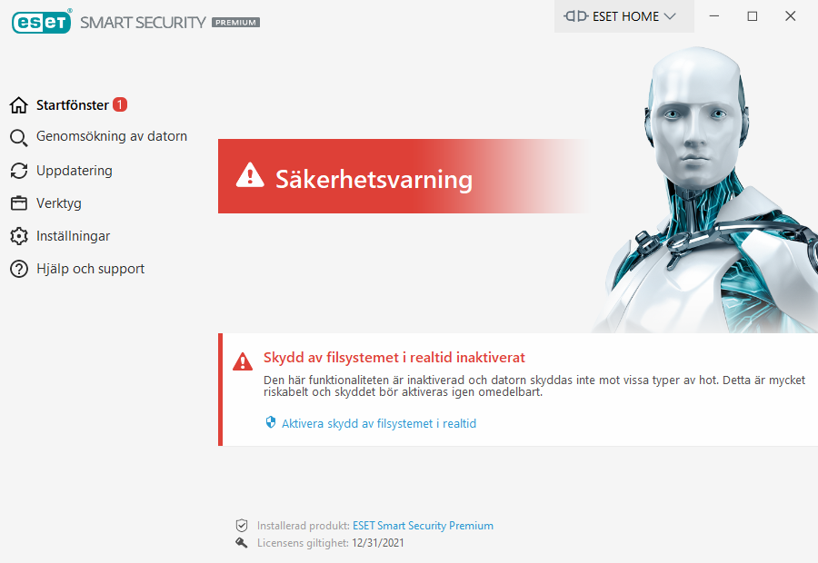 •Skydd av filsystemet i realtid är inaktiverat – skyddet av filsystemet i realtid har inaktiverats av användaren. Datorn skyddas inte mot vissa hot. Klicka på Aktivera skydd av filsystemet i realtid om du vill aktivera funktionen igen.