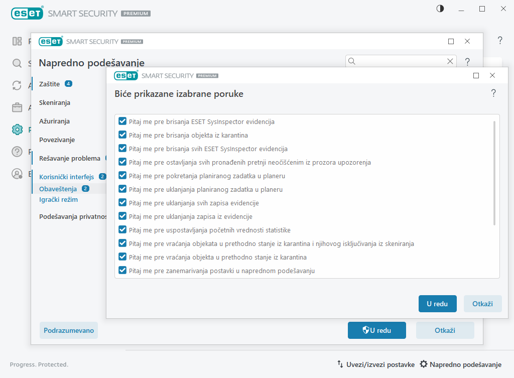 Αυτό το παράθυρο εμφανίζει μηνύματα επιβεβαίωσης που το ESET Security Ultimate θα εμφανίζει πριν από την πραγματοποίηση κάθε ενέργειας. Επιλέξτε ή καταργήστε την επιλογή του πλαισίου ελέγχου δίπλα σε κάθε μήνυμα επιβεβαίωσης, για να επιτρέψετε ή να απενεργοποιήσετε την εμφάνιση του αντίστοιχου μηνύματος.