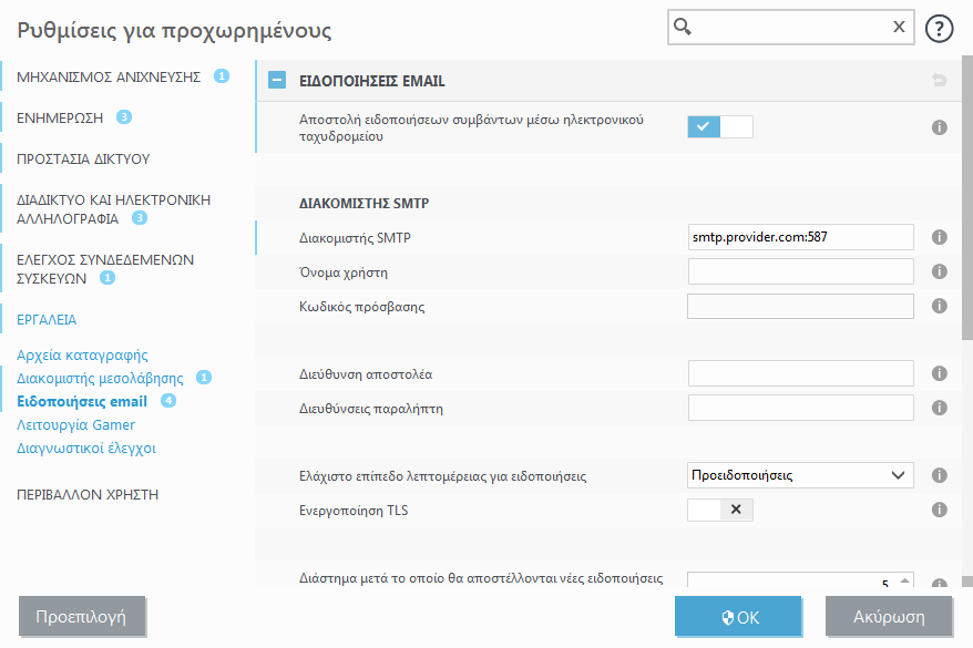 Διακομιστής SMTP – Ο διακομιστής SMTP που χρησιμοποιείται για την αποστολή ειδοποιήσεων (για παράδειγμα, για το smtp.provider.com:587, η προκαθορισμένη θύρα είναι 25).