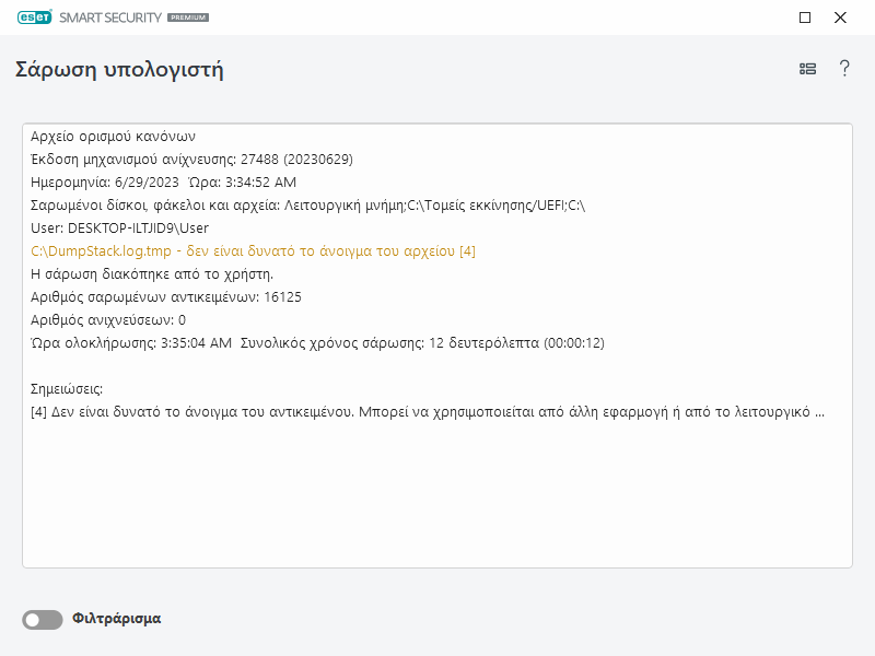 Για να βρείτε προηγούμενα αρχεία καταγραφής σάρωσης, στο κύριο παράθυρο του προγράμματος, επιλέξτε τα στοιχεία Εργαλεία > Αρχεία καταγραφής. Στο αναπτυσσόμενο μενού, επιλέξτε Σάρωση υπολογιστή και κάντε διπλό κλικ στην εγγραφή που θέλετε.