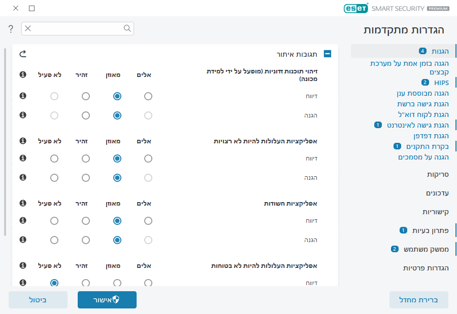 שינויים בהגנות יבוצעו רק על-ידי משתמש מנוסה. קביעה שגויה של הגדרות מנגנון האיתור עלולה להוביל לפגיעה ברמת ההגנה. |