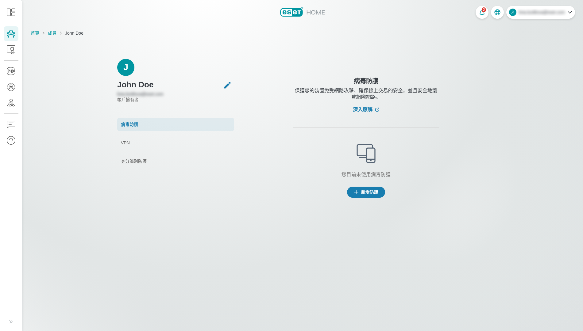 您可以透過 ESET HOME 帳戶指派特定功能,例如將 [防毒]、[虛擬私人網路] 和 Password Manager 指派給家庭成員。帳戶擁有者將能看到誰在使用安全性功能,以及家庭成員享有的防護方式。