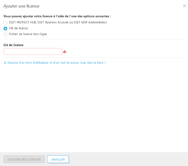 Dans le champ Clé de licence, saisissez ou copiez et collez la clé de licence que vous avez reçue lors de l'achat de votre solution de sécurité ESET et cliquez sur Ajouter des licences .