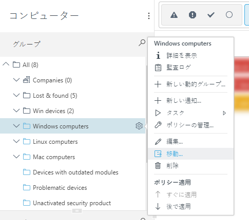 歯車アイコンgear_icon > 編集 > 親グループの変更を選択します。リストから新しい親グループを選択して、OKをクリックします。