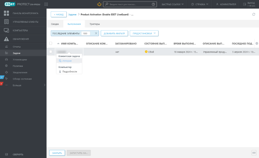 •Если в таблице История нет ни одной записи, установите для фильтра Произошло более длительный период. •При установке более ранних продуктов ESET сообщение трассировки будет следующим: Задача доставлена в управляемый продукт. |