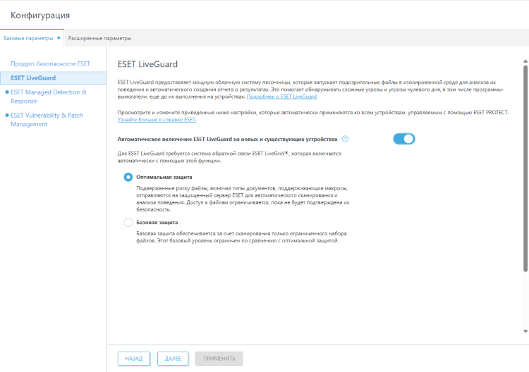 Рекомендуем выбрать опцию Оптимальная защита, чтобы назначать новые политики с максимальной защитой. Кроме того, вы можете изменить свой выбор с помощью элемента ESET LiveGuard Advanced в разделе Модули платформы. |